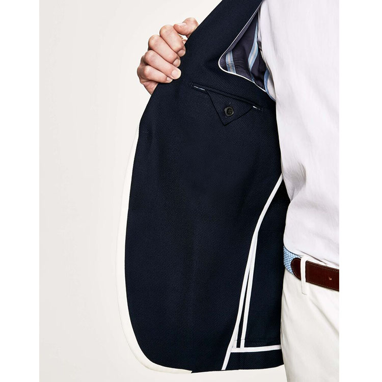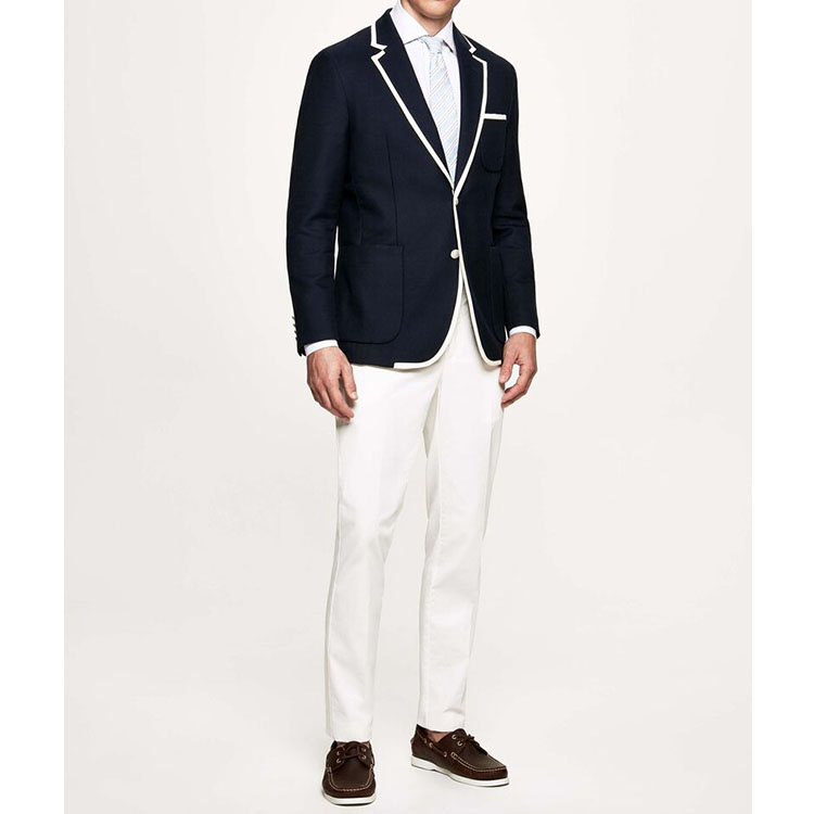 Blazer 1. Lapel:inserted notch lapel 2. Pocket:patch pockets 3. Closing:single-breasted, 2 buttons 4. Sleeve buttons:4 buttons kissing 5. Breast Pocket:patch pocket 6. Back vent: double vents 7. Lining:none 8. Characteristic:fashionable, classic England style,good details