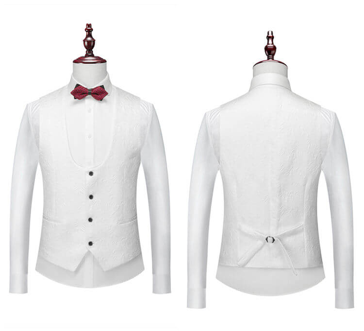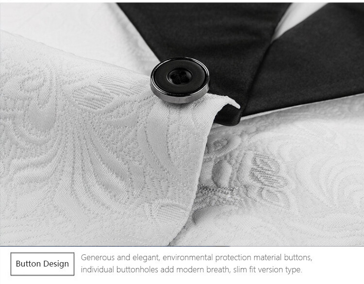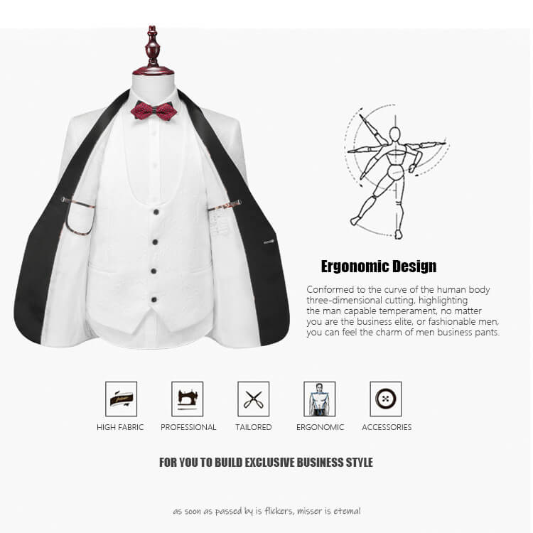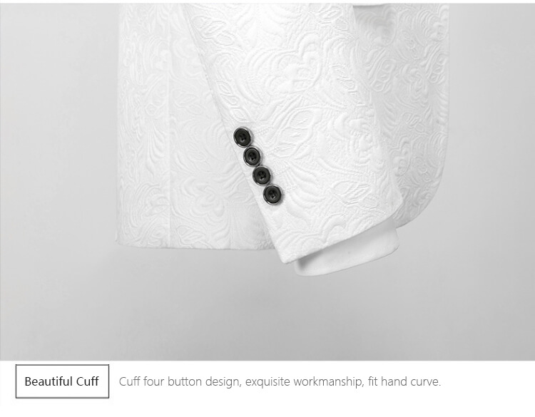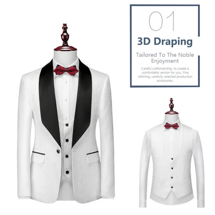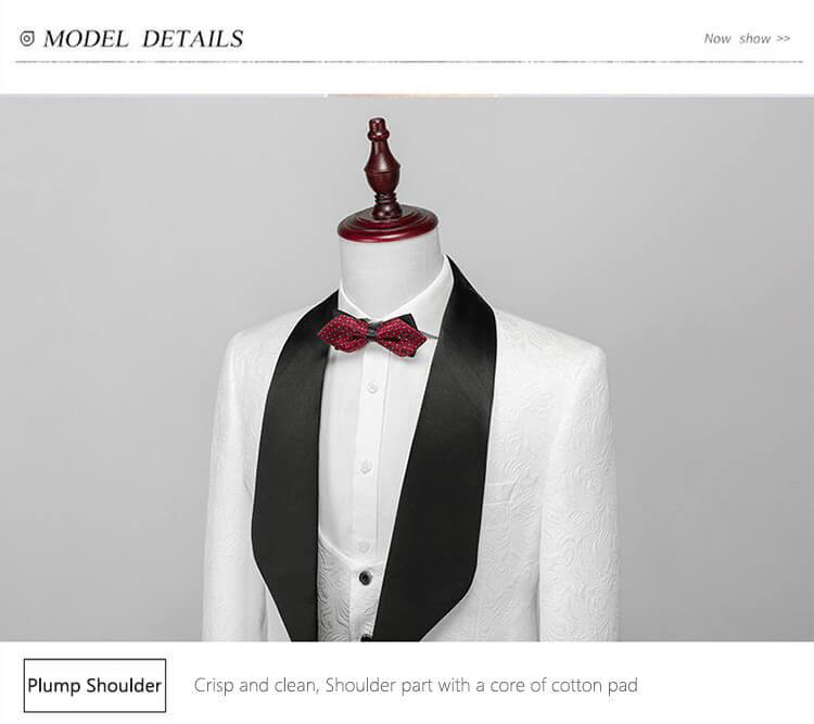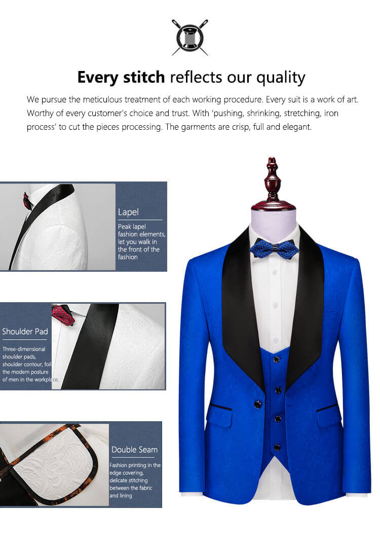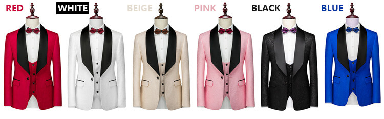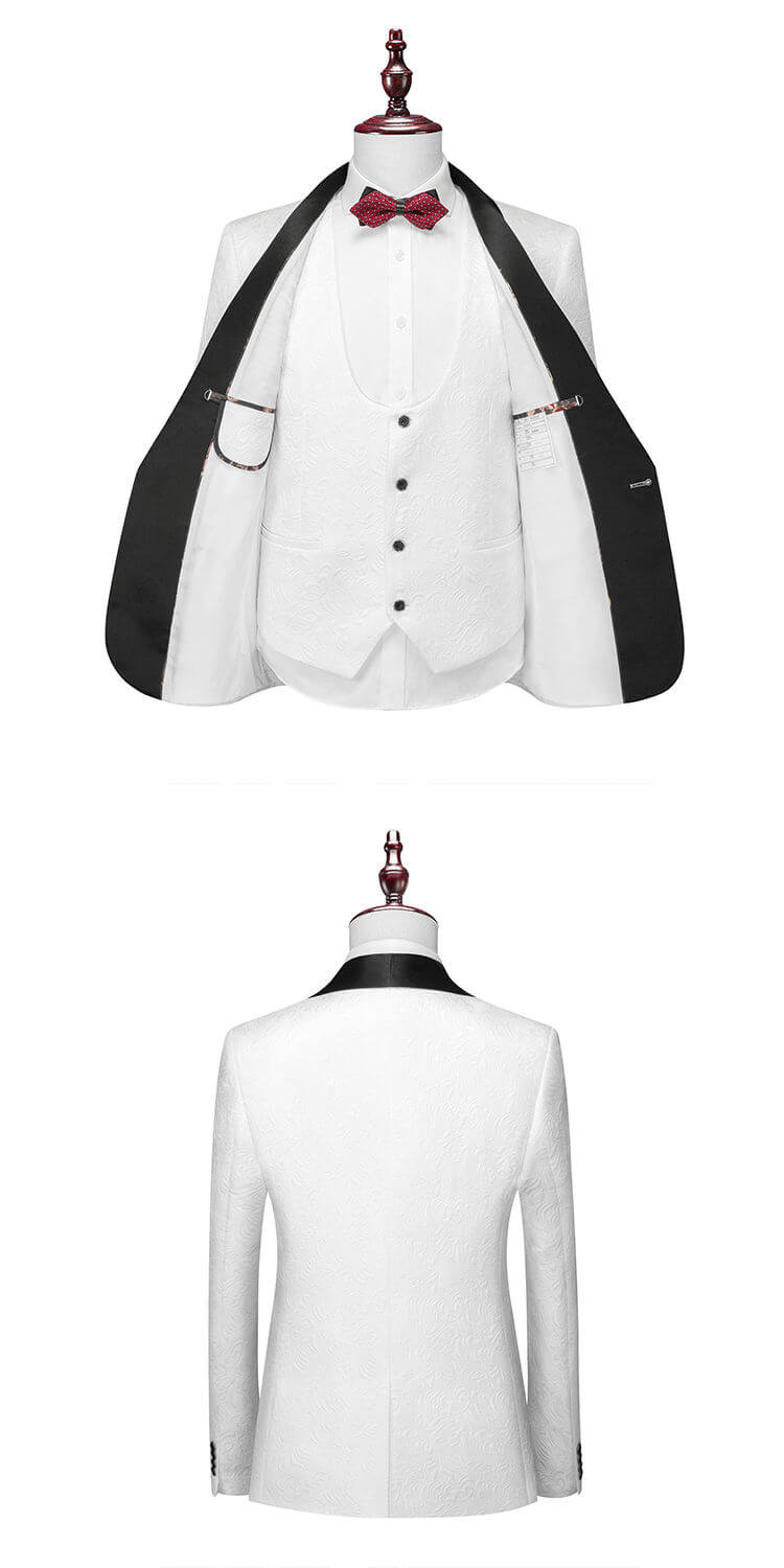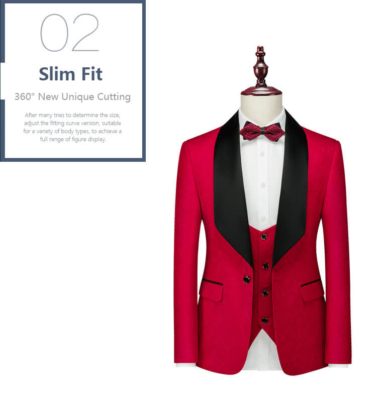 Mens 3 piece black satin shawl lapel formal suits blazer red jacquard fabric stage man's shawl collar suits